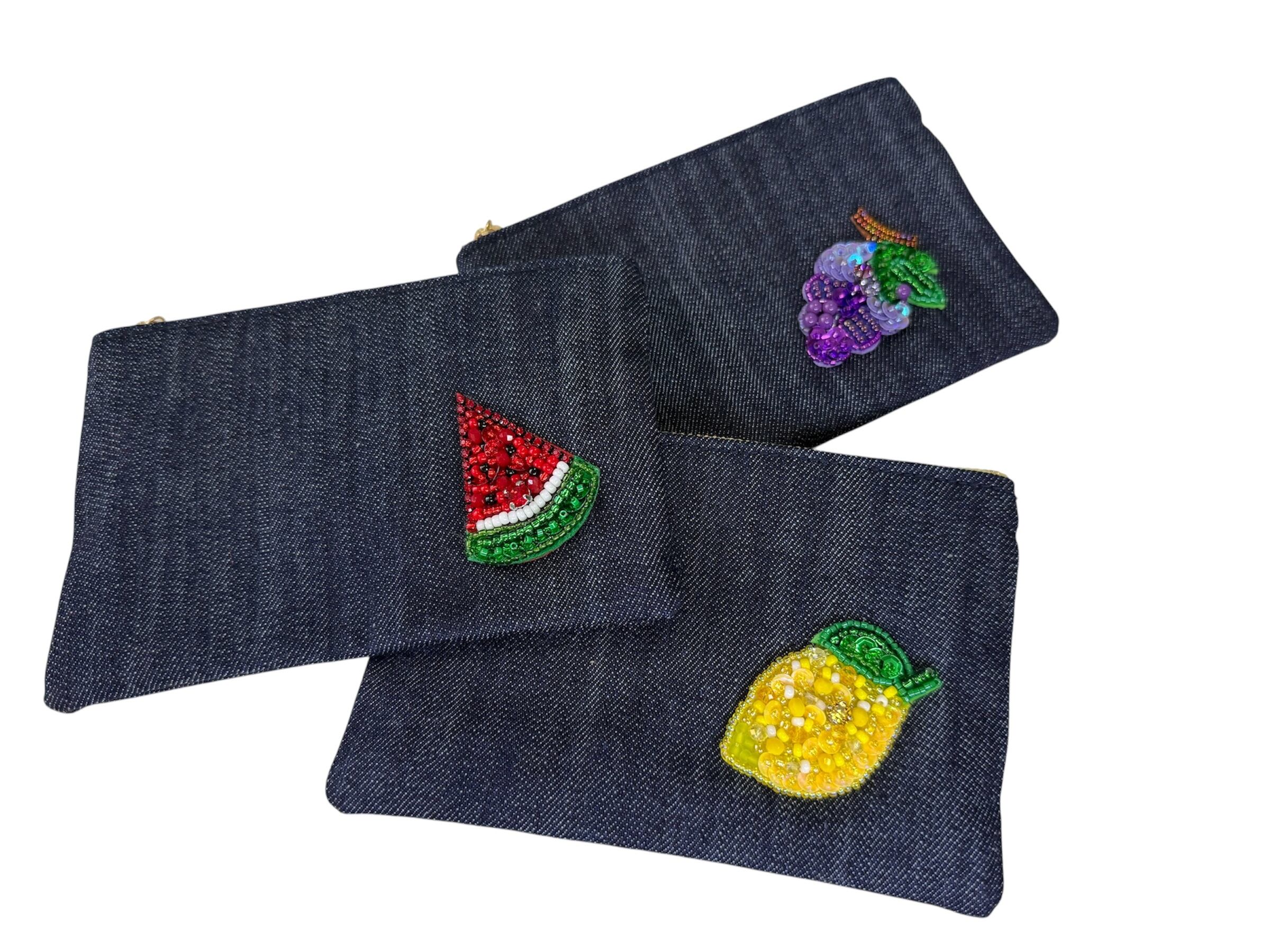 デニム地にキラキラのビーズアップリケがワンポイントで施されており、オリジナルの可愛いポーチが完成しました。バッグに入れやすいサイズで、メイクお直し用のリップをいれたり、カード入れにも使えるミニポーチです。